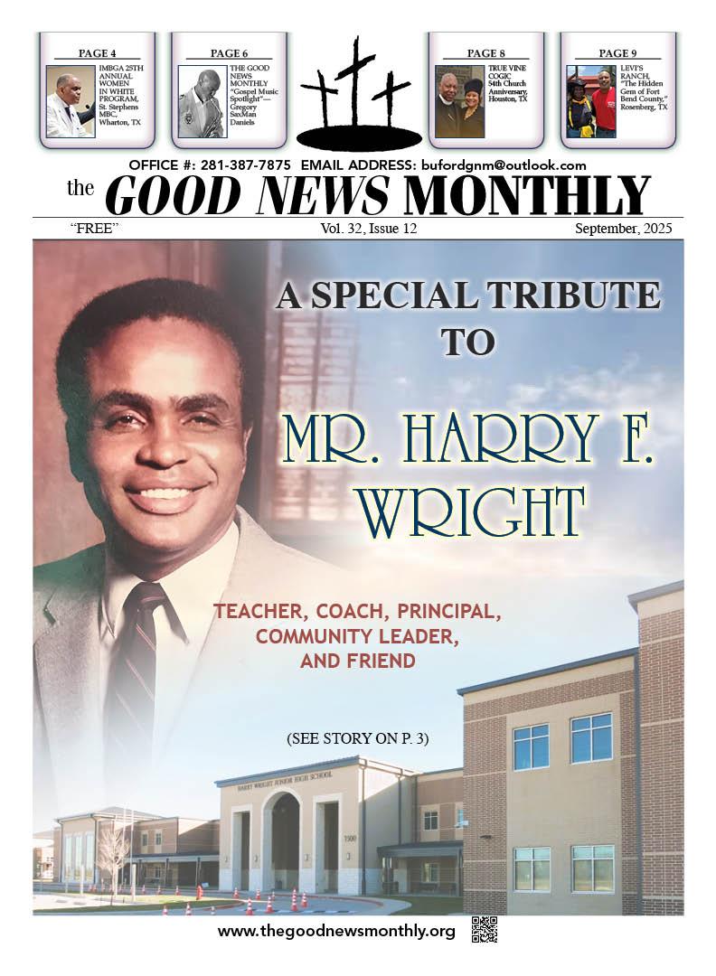 The GOOD NEWS MONTHLY is published the first week of each month. It is one of several ministries of the Rev. Michael D. Buford Ministries, founded in 1986. The first publication of the “GOOD NEWS” was on September, 1992. Letters, articles, announcements, and advertisements should be sent to the “GOOD NEWS” by the 20th of the preceding month it will be published in. Information may also be faxed to 281-232-2460. Letters or articles may be edited for clarity or space. FREE ADS and PRESS RELEASES are subject to availability of space. THE GOOD NEWS MONTHLY reserves the right to reject advertising and other material which is deemed not to be in the best interest of our publication. Send pictures, with SASE if you want your pictures returned, to The Good News Monthly, 817 5th Street, Rosenberg, TX 77471.