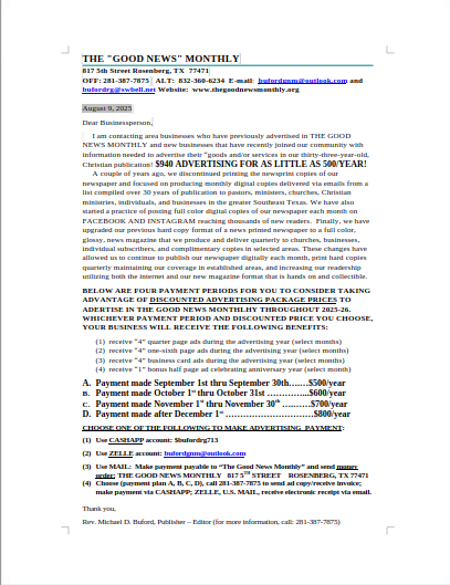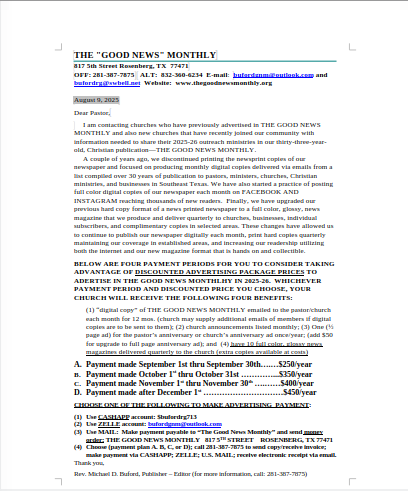 Pastor Michael Buford E-mail: bufordgnm@outlook.com (use to pay with Zelle) Cash tag: $bufordrg713 (use to pay with Cash App)
