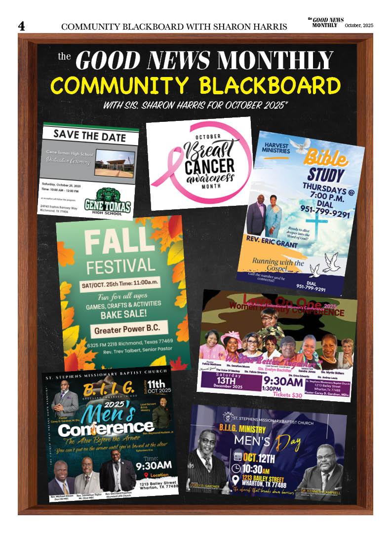 Contact the Good News Monthly at (281) 387-7875/(832) 360-6234 or Sister Harris at (346) 538-8493.